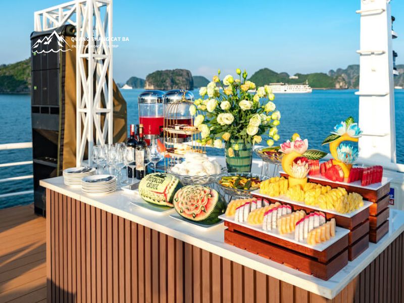 Buffet lunch is served while cruising through the limestone scenery of Lan Ha Bay.