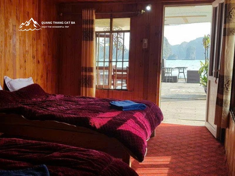 Accommodation is provided at a FLOATING HOUSE anchored in Lan Ha Bay. Rooms are simple but comfortable, with meals served fresh on site.