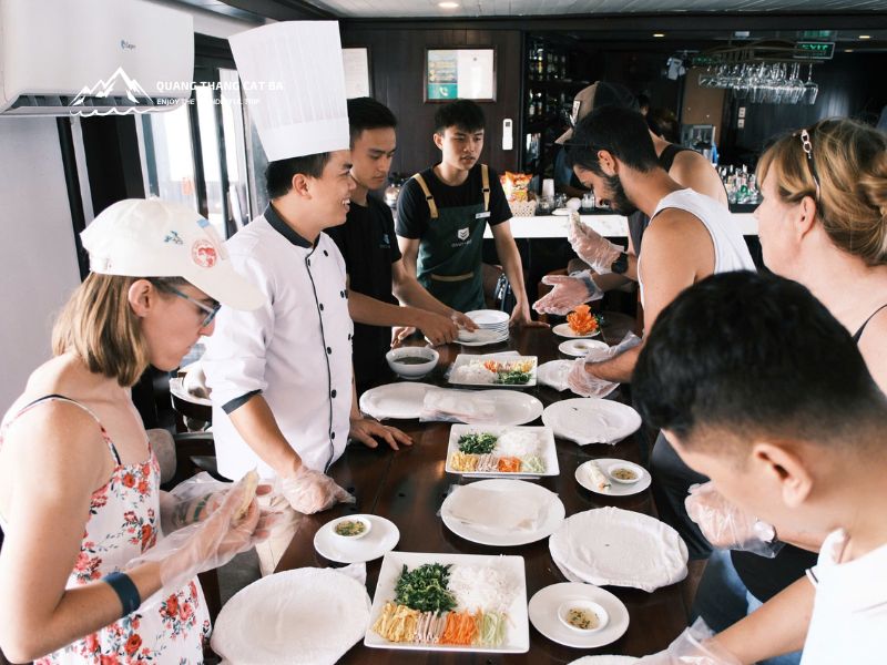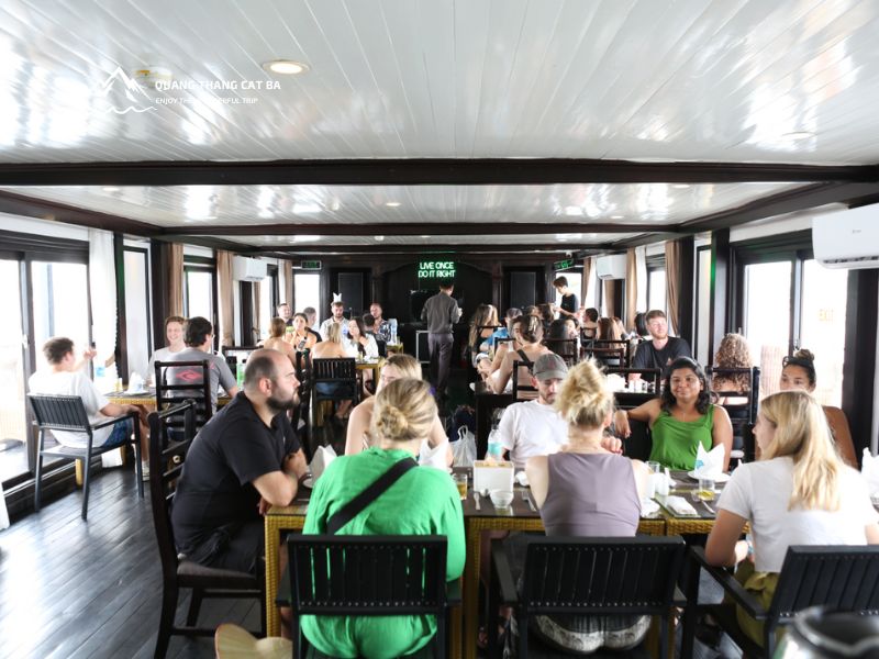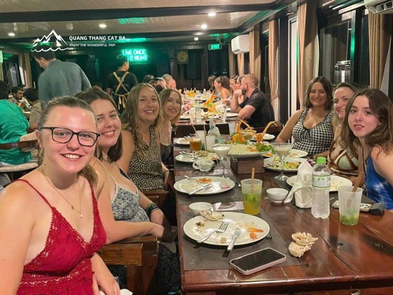 Mỗi bữa ăn trên tàu đều được chuẩn bị kỹ lưỡng, kết hợp hải sản tươi sống với hương vị Việt Nam và quốc tế. Bạn còn được tham gia kayak, bơi lội, tiệc hoàng hôn, câu mực đêm, cùng nhiều hoạt động hấp dẫn khác — tất cả đều đã nằm trong giá tour.