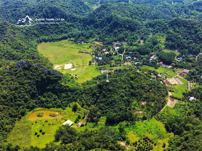 Từ trên cao, bạn có thể ngắm toàn cảnh Trân Châu ẩn hiện giữa màu xanh bạt ngàn, xa xa là biển Cát Bà lấp lánh dưới nắng.